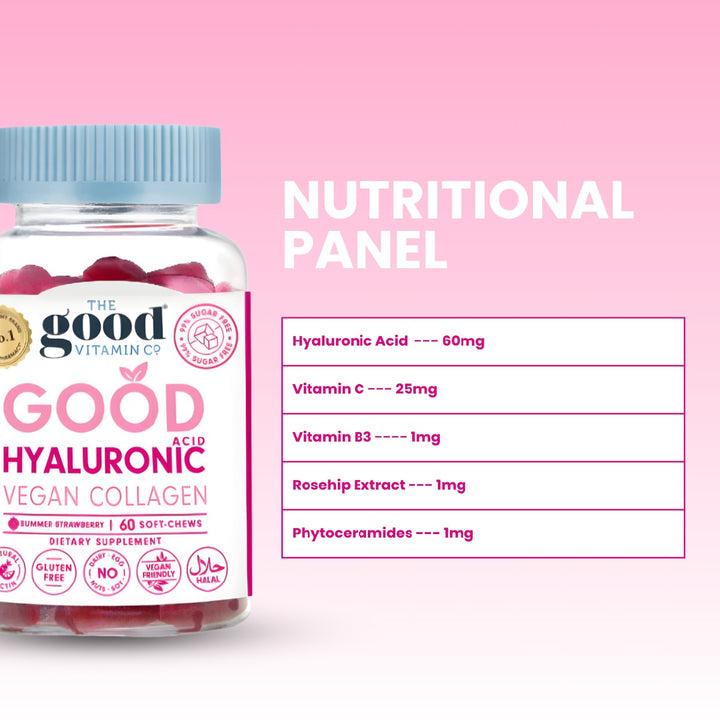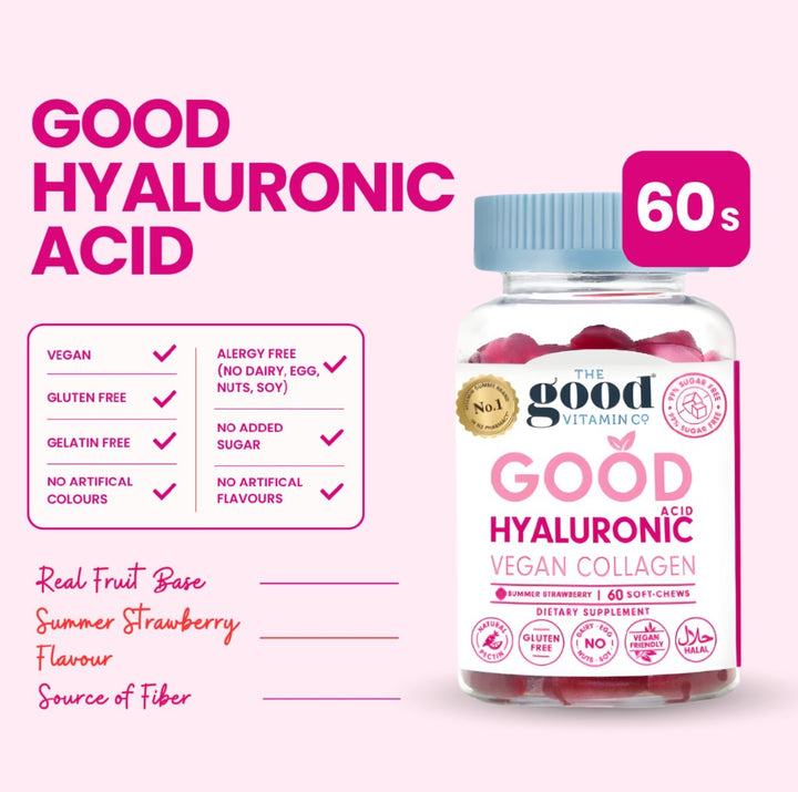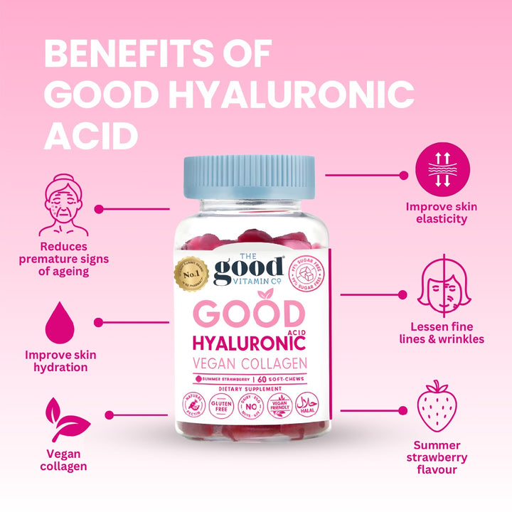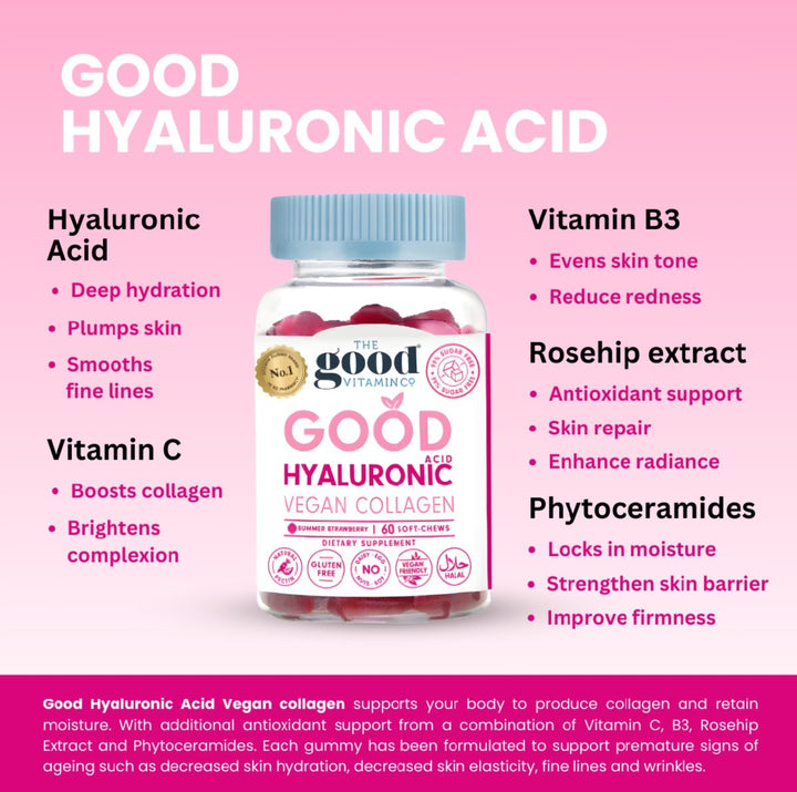 Good Hyaluronic Acid Vegan Collagen helps your body naturally produce collagen and retain essential moisture for healthy, radiant-looking skin. Enhanced with powerful antioxidants from Vitamin C, Vitamin B3, Rosehip Extract, and Phytoceramides, these delicious strawberry soft-chews help fight premature signs of ageing such as dryness, loss of firmness, fine lines, and wrinkles.