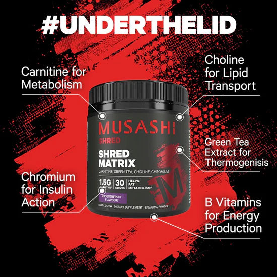 Musashi Shred Matrix 是您终极的表现伙伴,采用独特配方,可促进新陈代谢、增强脂肪燃烧并在锻炼期间增强能量。这款优质配方融合了肉碱、绿茶提取物、必需营养素和氨基酸,可帮助您获得更精瘦、更清晰的体格并提高运动表现。
